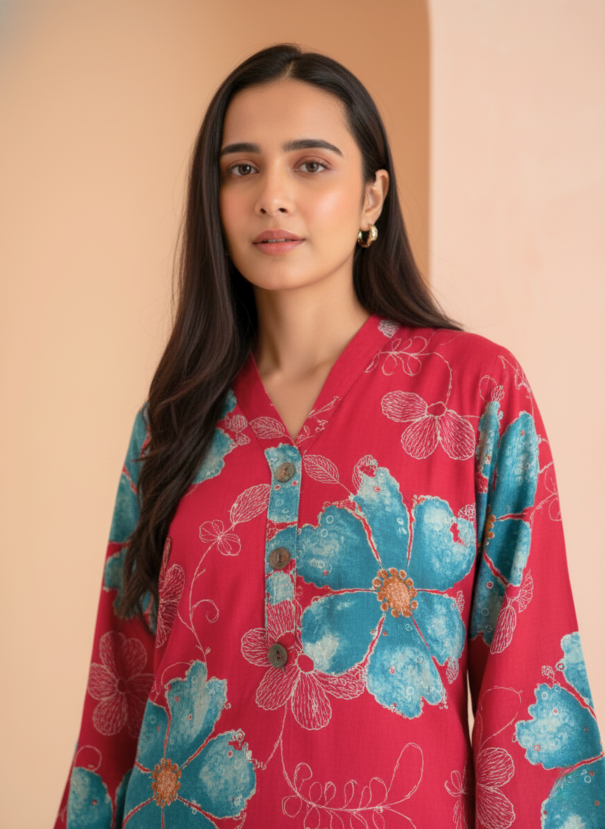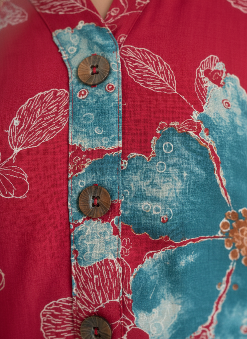 | Details & Print | **Bold, large-scale teal floral print** with fine white outline detail on a rich red/fuchsia base, creating a uniform, statement look. |