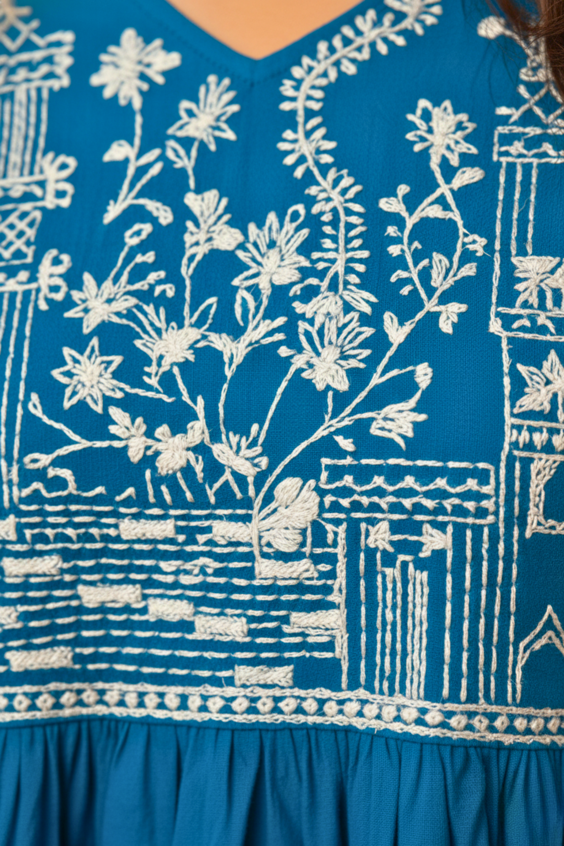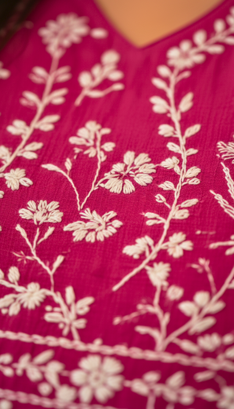 | Details & Features | Intricate **white thread embroidery** across the yoke. The gathered waist releases into a flattering peplum flare. Monochromatic design ensures a sophisticated look. |