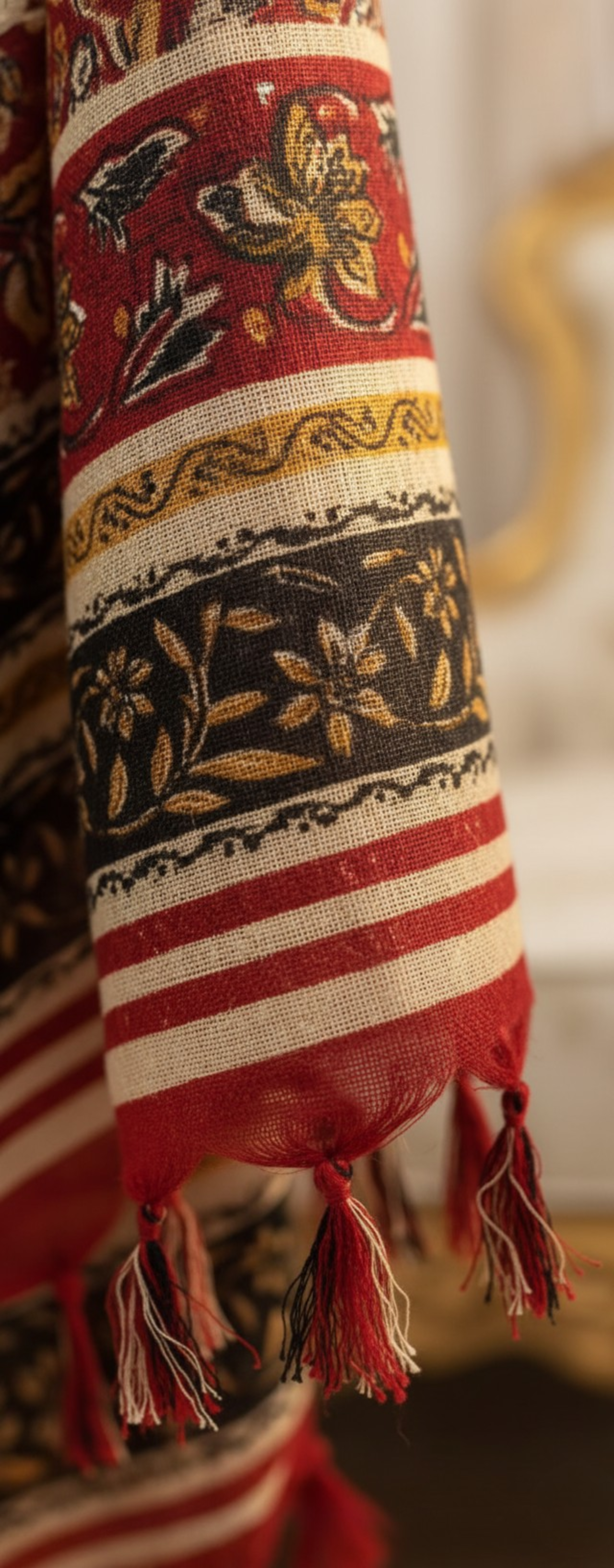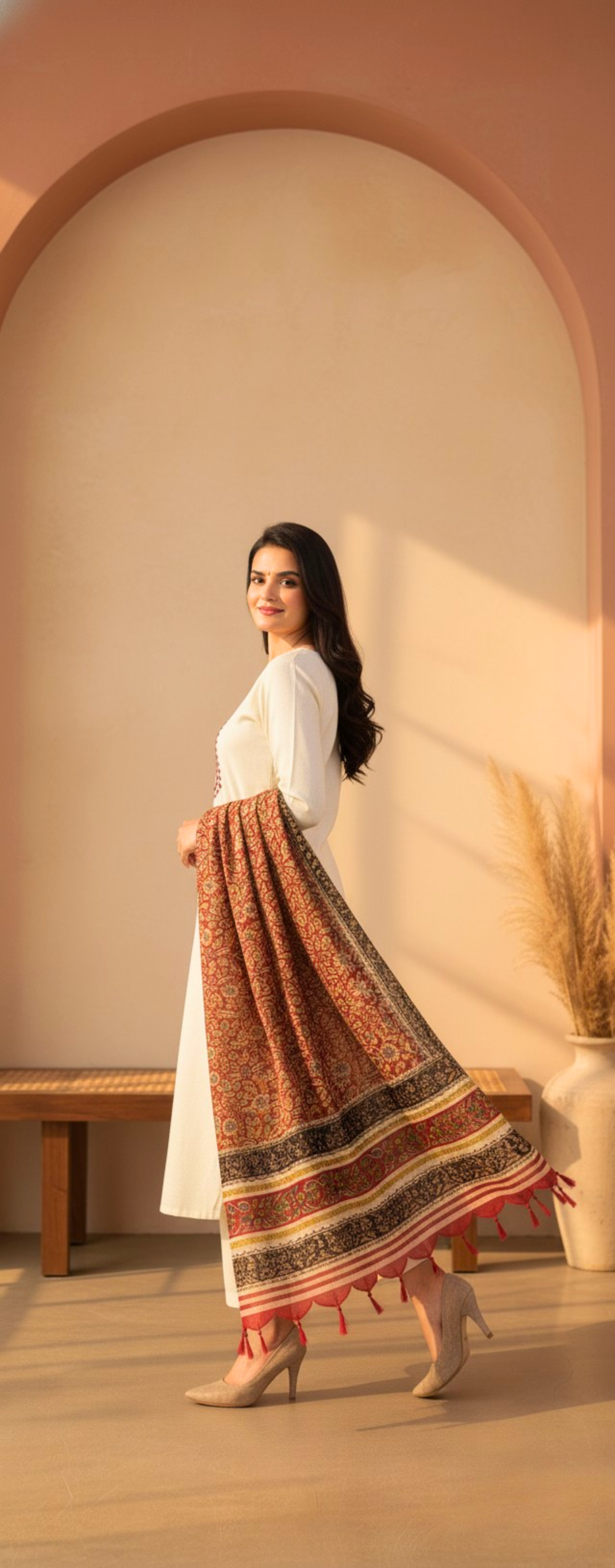 | Dupatta | Wide, richly **patterned shawl/dupatta** featuring deep reds, browns, and blacks in a traditional block print, finished with tassels. |