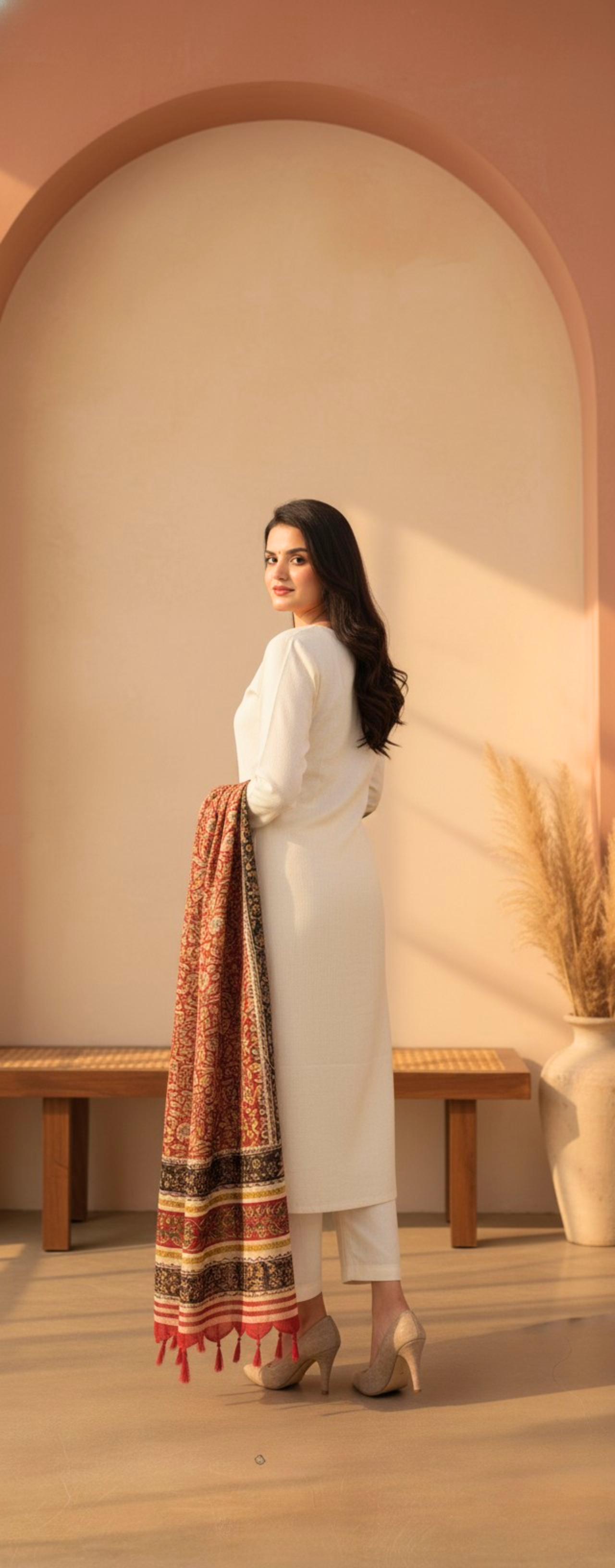Kurta/Trousers: Classic Ivory White (#F5F5DC) Accent/Dupatta: Deep Scarlet Red/Multi-Pattern |
