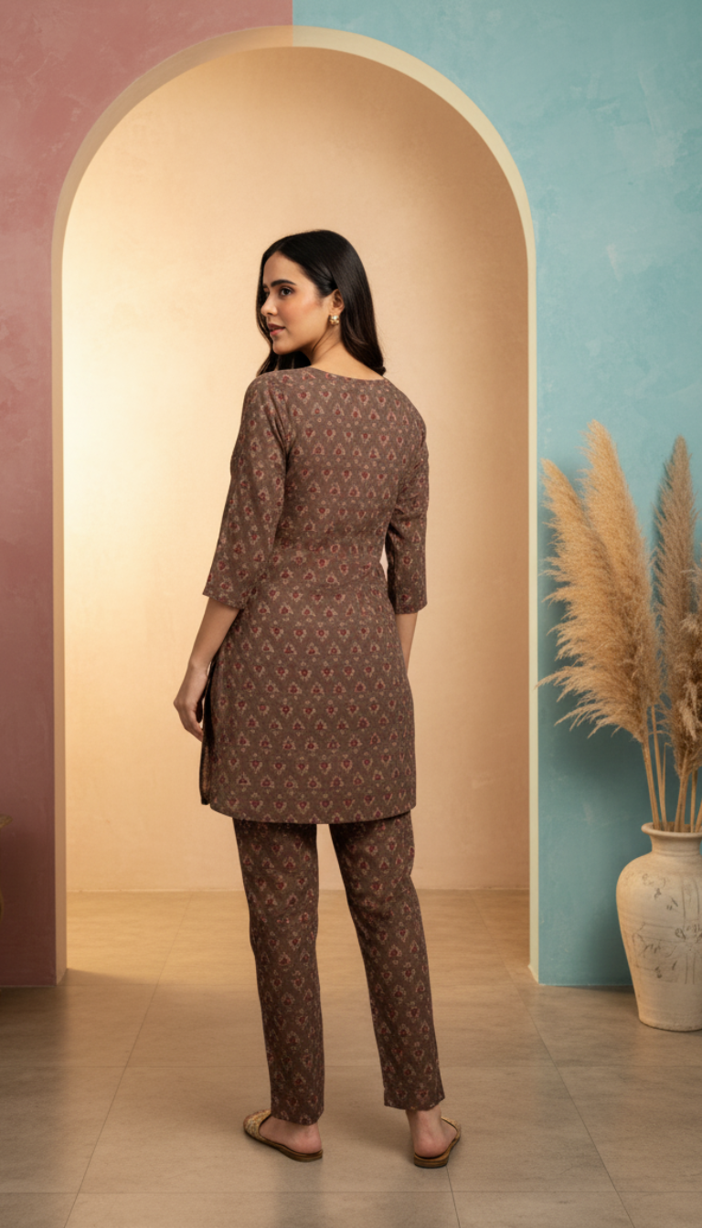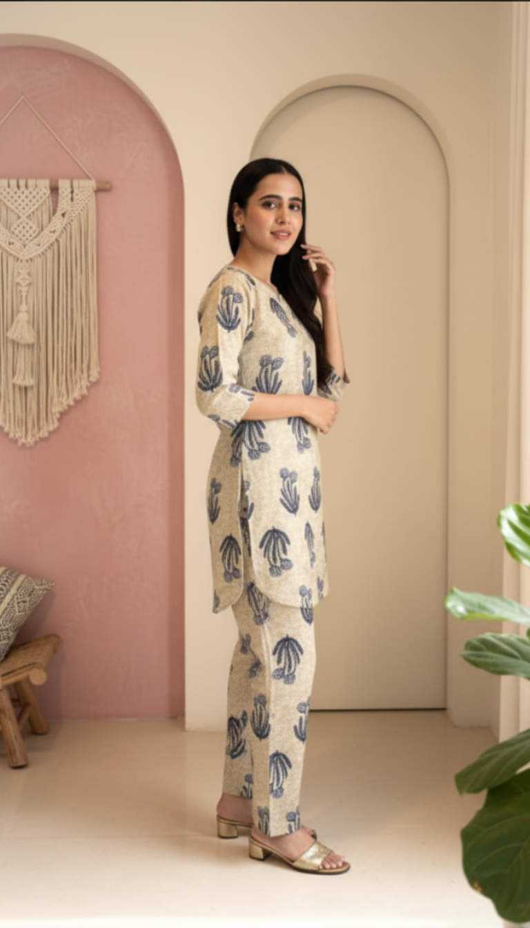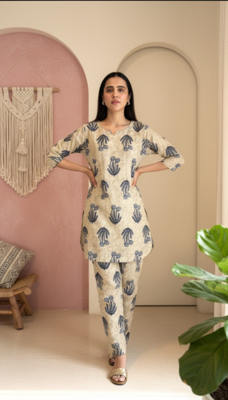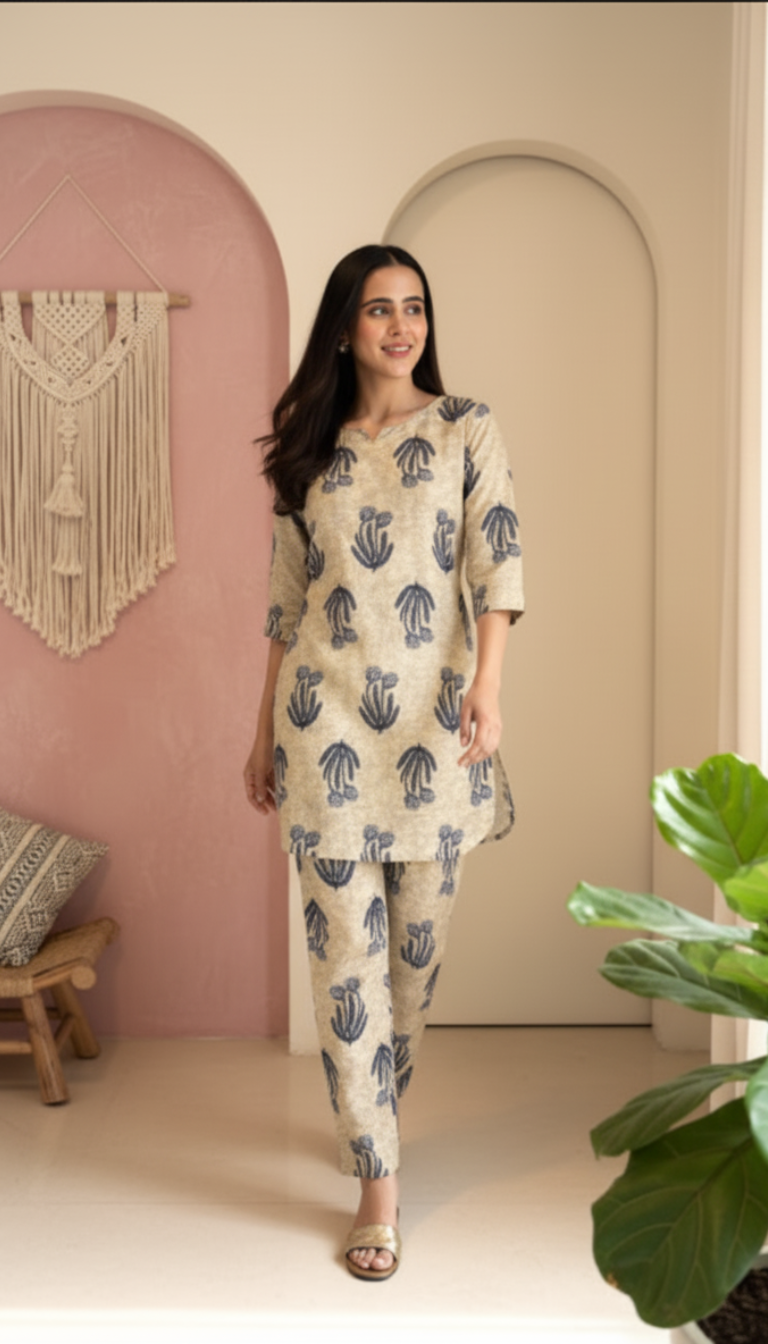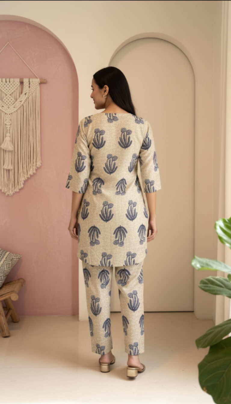 Details & Features Features **all-over traditional block prints** on both the tunic and trousers. The comfortable, short tunic has side slits and a slightly rounded hemline.