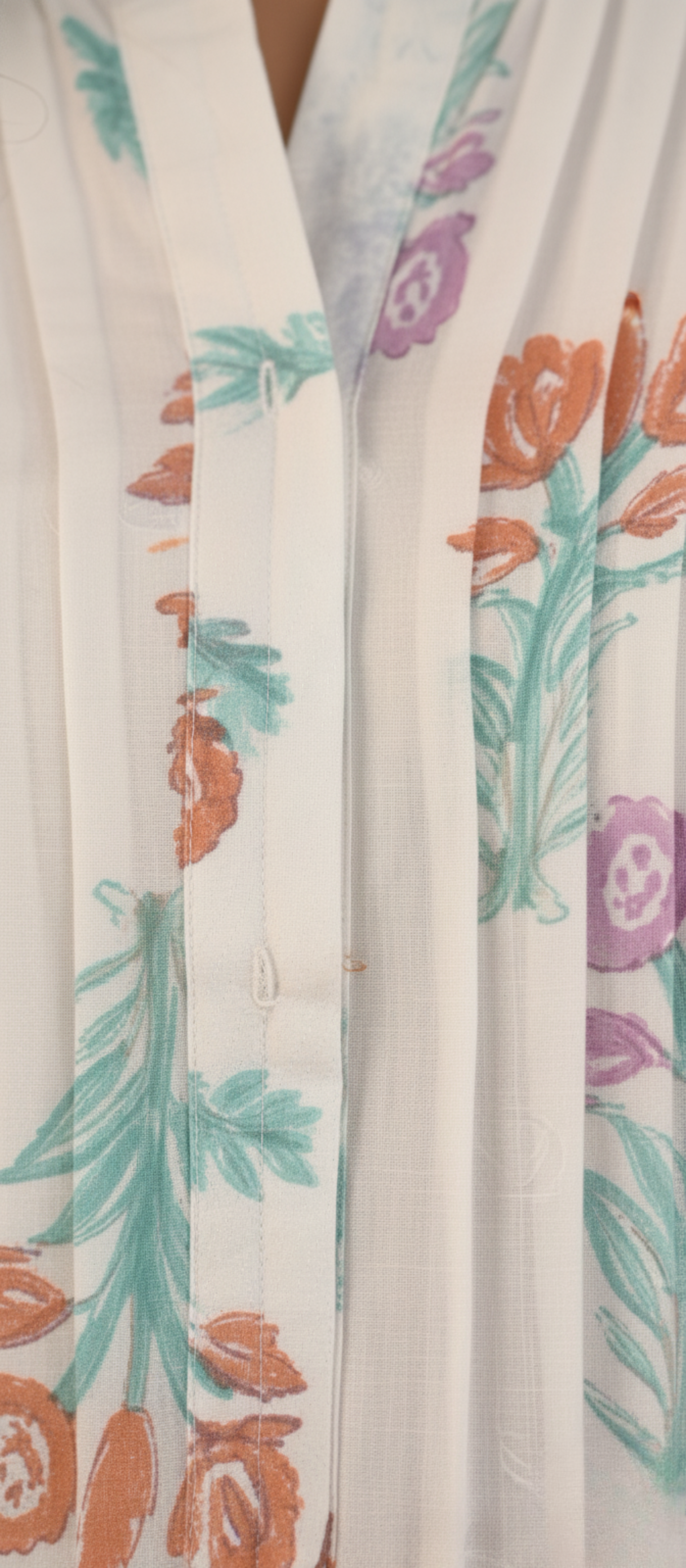 | Details | **Multi-colored botanical print** (teal, lavender, pink) scattered over the body. Vertical pleating releases a gentle flare for a graceful drape. |